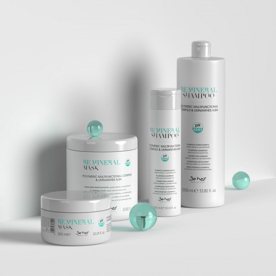 Be hair neapsunkinantis, apimties suteikiantis šampūnas, ploniems plaukams BE MINERAL (pH4.3-4.7)