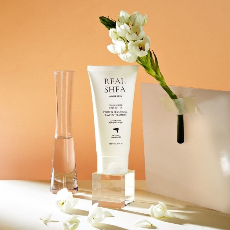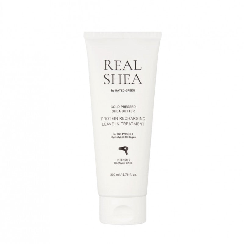 REAL SHEA Nenuplaunama kaukė plaukams su proteinais „Cold Pressed Shea Butter Protein Recharging Leave-in Treatment“